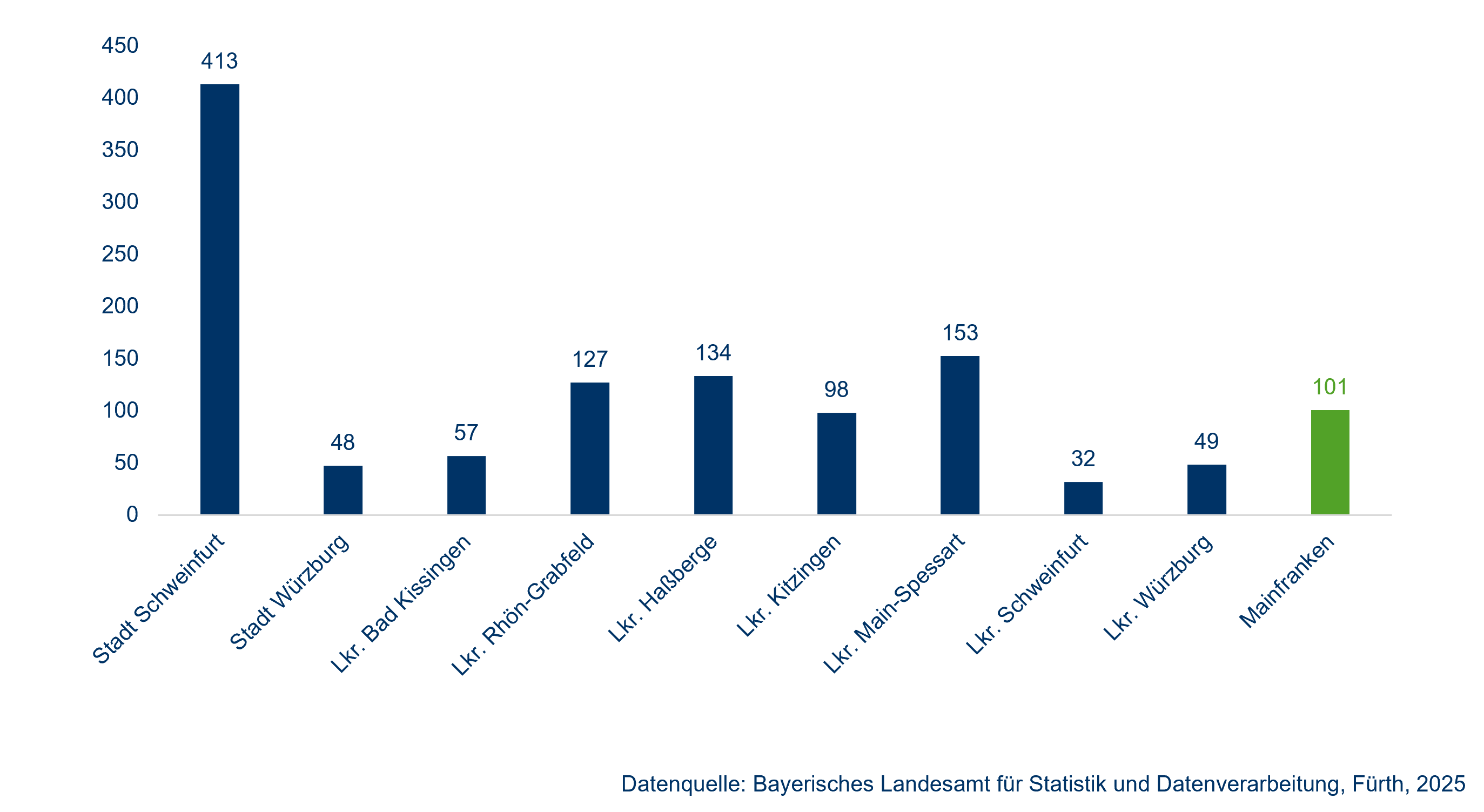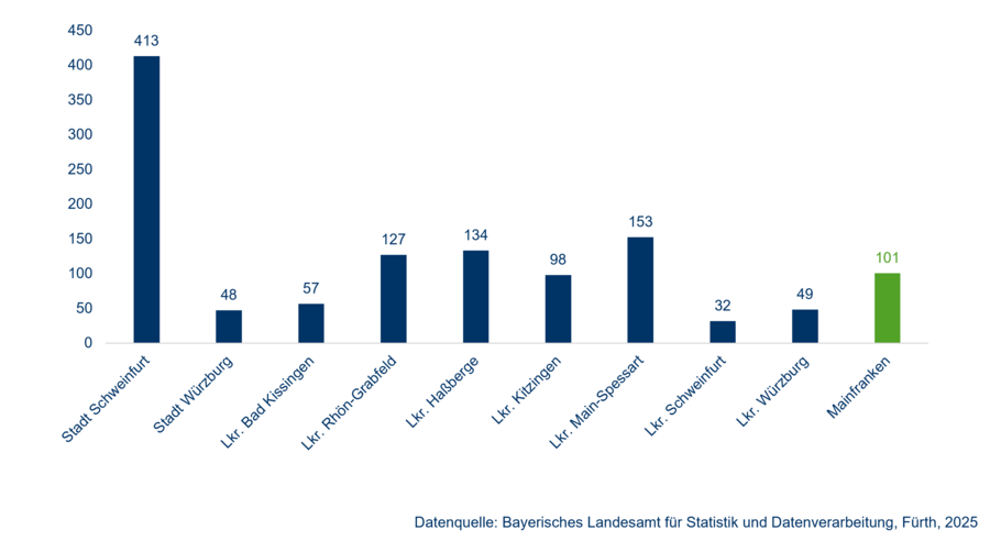 Dass der Branche in Mainfranken ein hoher Stellenwert zukommt, verdeutlicht auch ein Blick auf die Bruttowertschöpfung. So entfiel auf das verarbeitende Gewerbe (Abschnitt C) im Jahr 2023 eine Bruttowertschöpfung von rund 10,4 Mrd. Euro. Bezogen auf die gesamte Bruttowertschöpfung der Region in Höhe von 42,6 Mrd. Euro entspricht dies einem Anteil von 25 Prozent. Rund 60 Prozent der mainfränkischen Bruttowertschöpfung im verarbeitenden Gewerbe wird in drei Gebietskörperschaften erwirtschaftet: Spitzenreiter ist die Stadt Schweinfurt (26 Prozent), gefolgt von den Landkreisen Main-Spessart (22 Prozent) und Rhön-Grabfeld (11 Prozent).