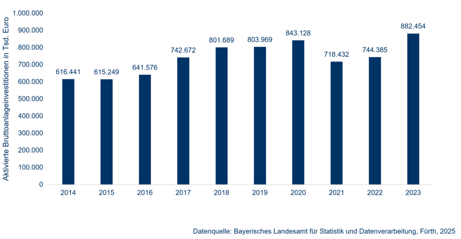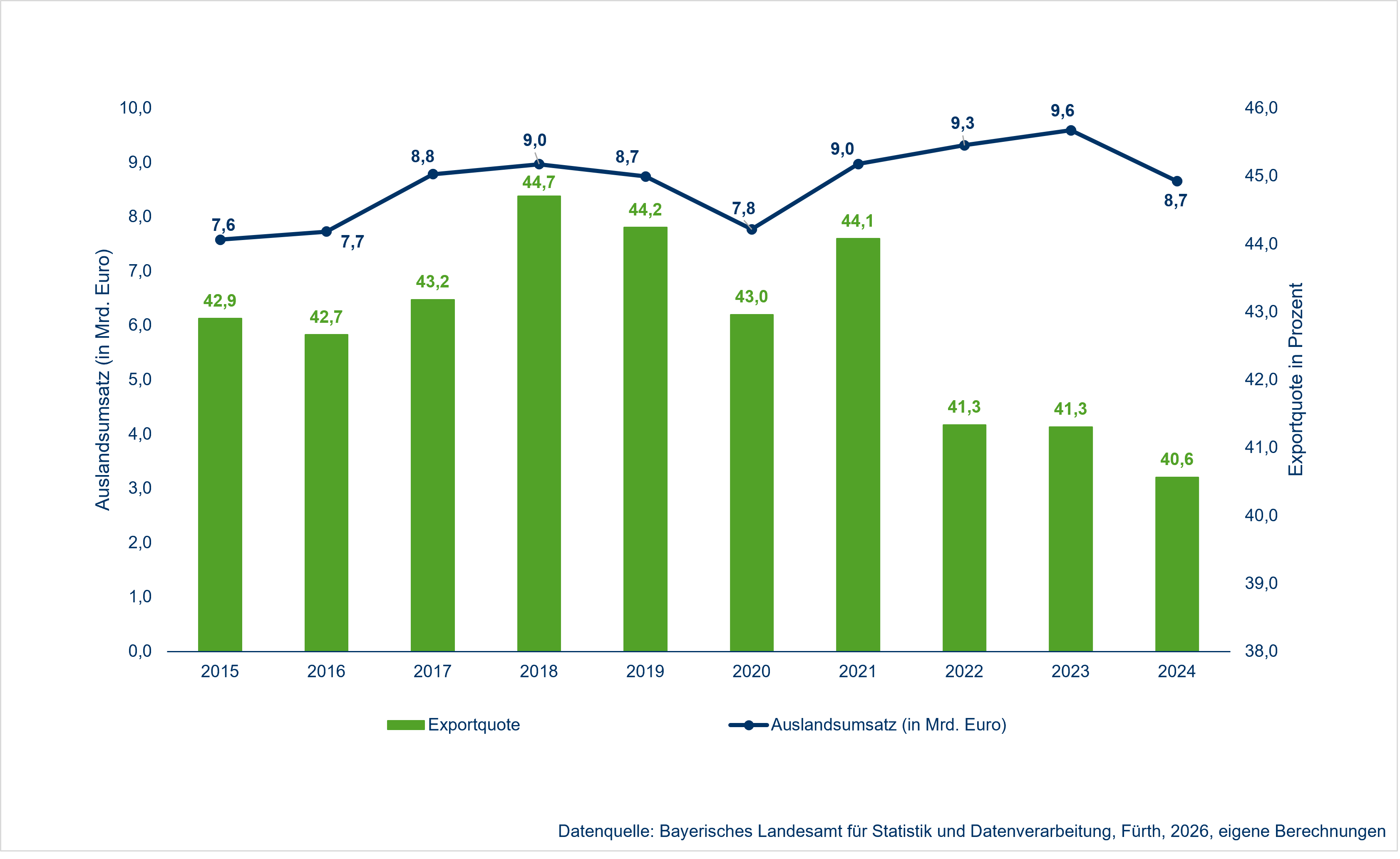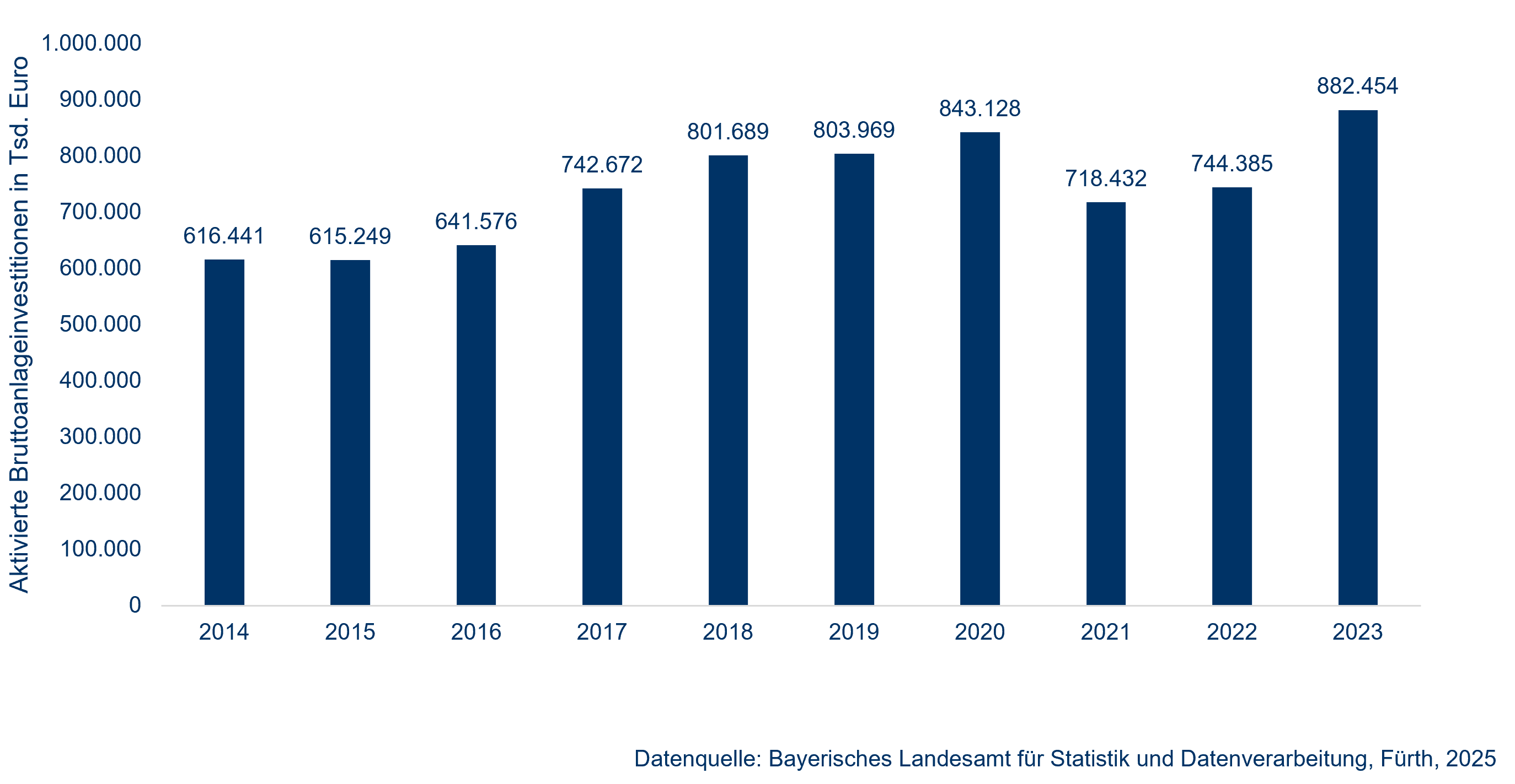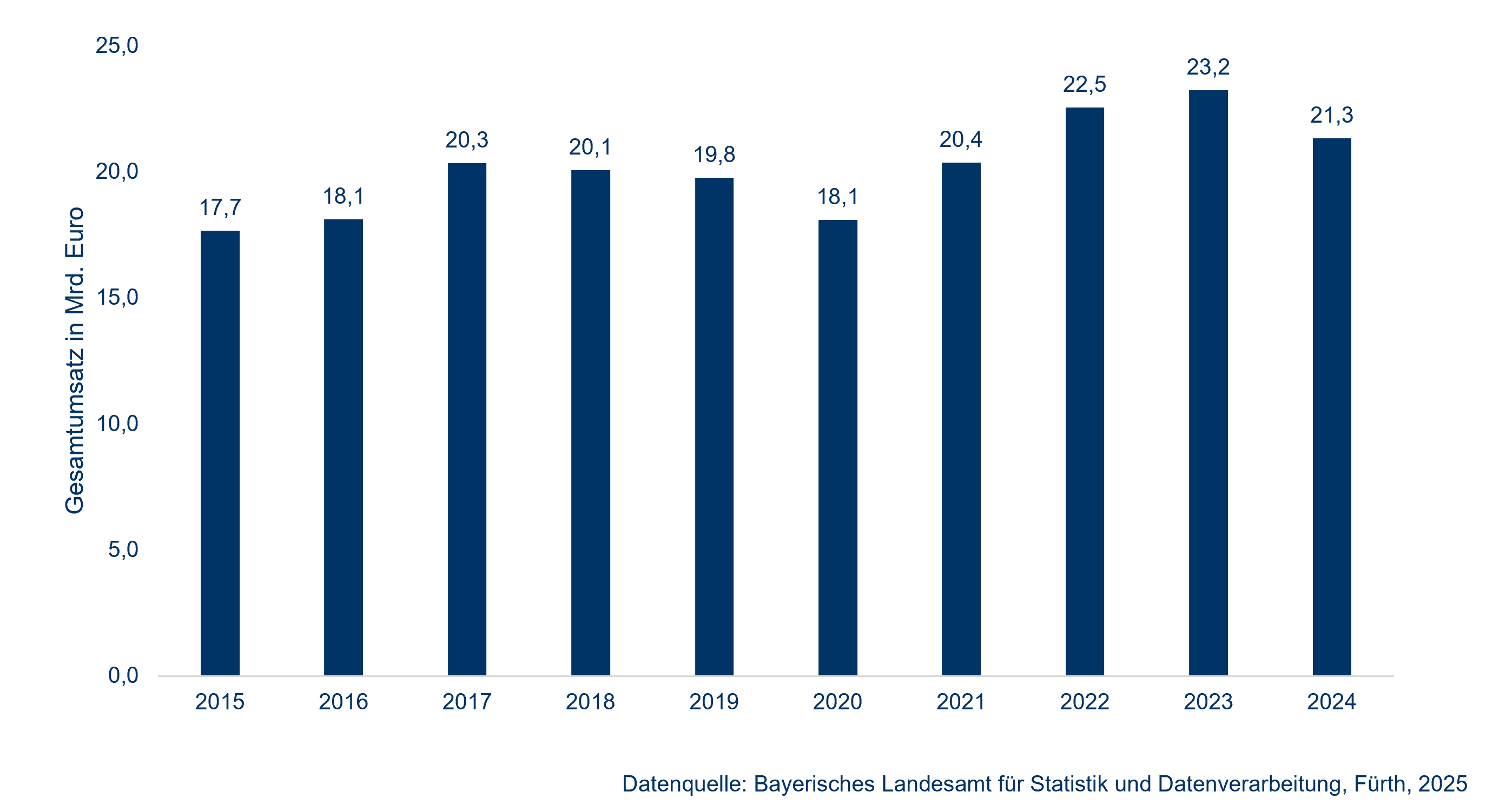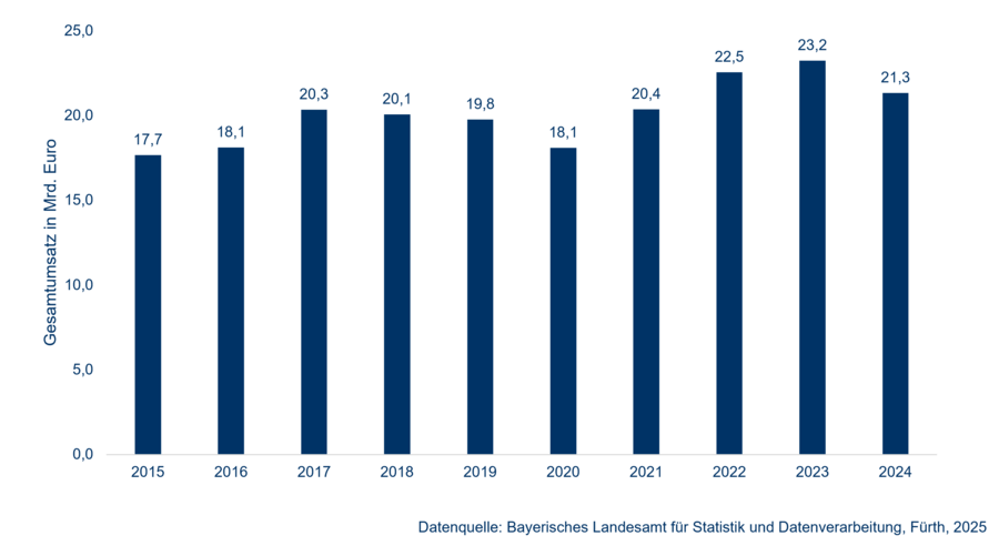 Die mainfränkischen Betriebe des verarbeitenden Gewerbes erzielten im Jahr 2024 einen Gesamtumsatz von rund 21,3 Mrd. Euro, wovon rund 41 Prozent im Ausland generiert wurden. Laut Investitionserhebung des Bayerischen Landesamtes für Statistik investierten die Betriebe im Jahr 2023 rund 882,5 Mio. Euro.