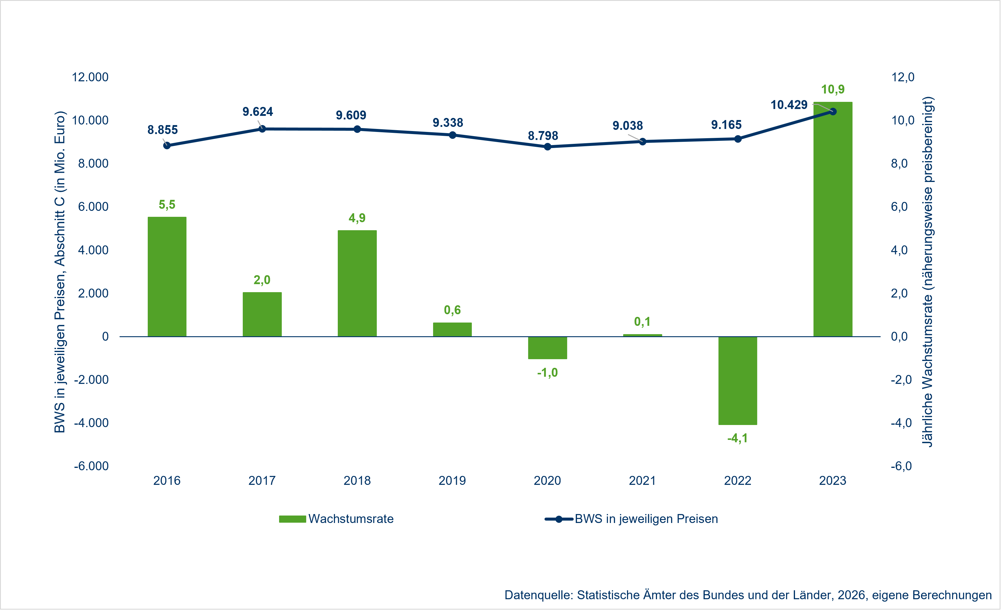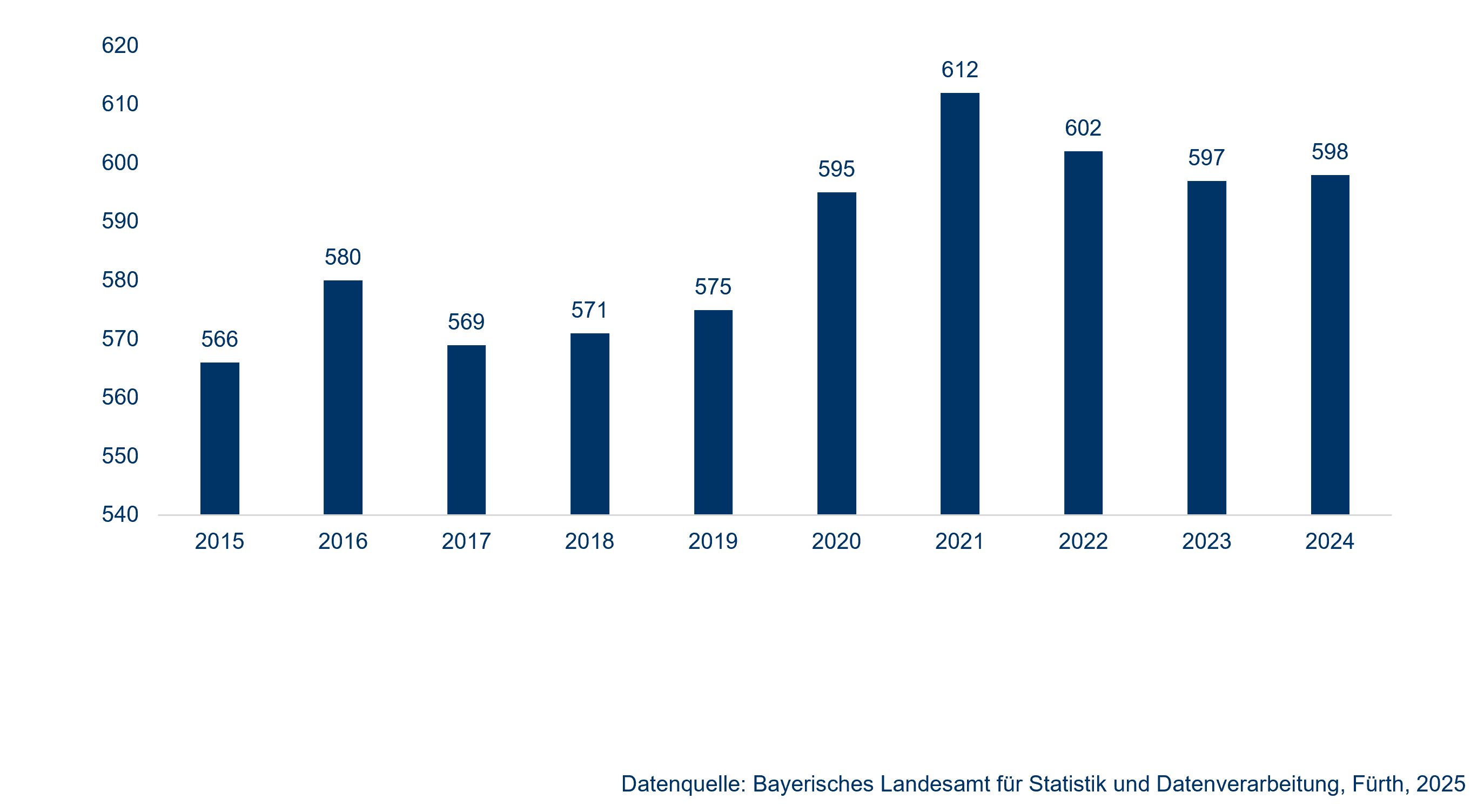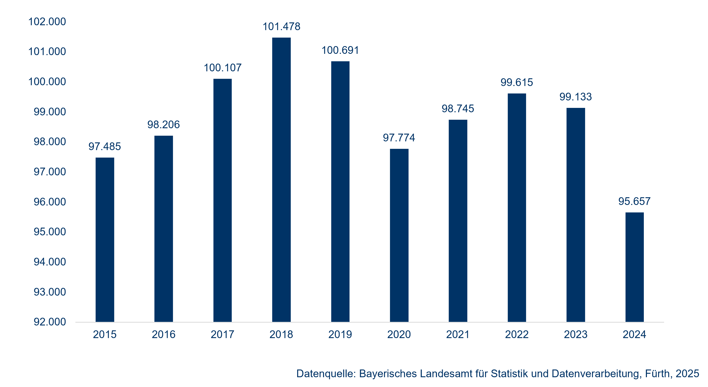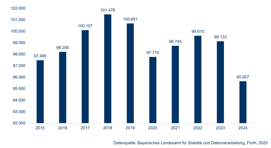 Die amtliche Statistik zählt zur Industrie diejenigen Betriebe, die dem verarbeitenden Gewerbe (Abschnitt C) einschließlich des Bergbaus und der Gewinnung von Steinen und Erden (Abschnitt B) angehören. Dabei bezieht sich diese Statistik ausschließlich auf Betriebe, die mindestens 20 Mitarbeiter beschäftigen. Mainfrankenweit fallen hierunter im Jahr 2024 insgesamt 598 Unternehmen, in denen rund 95.700 Personen beschäftigt sind. Betrachtet man hingegen alle im verarbeitenden Gewerbe sozialversicherungspflichtig beschäftigten Personen, liegt die Zahl bei rund 105.500, was rund 26 Prozent aller sozialversicherungspflichtig Beschäftigten in Mainfranken entspricht.