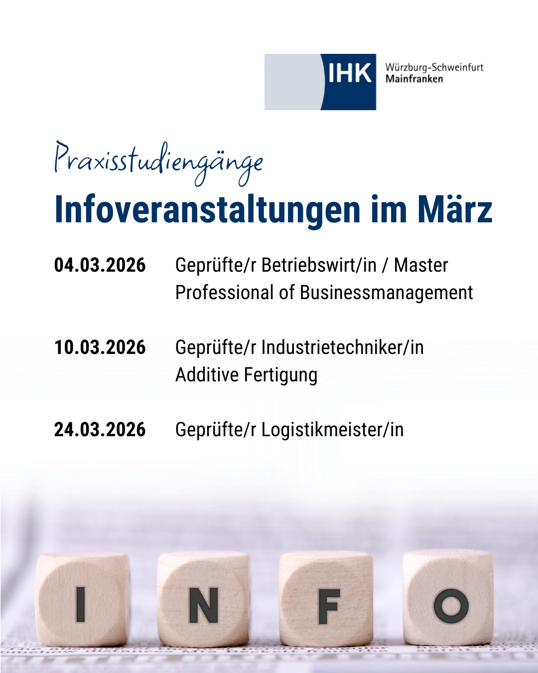 Im März stellen wir drei ausgewählte Praxisstudiengänge aus unserem vielfältigen Angebot vor. In den kostenlosen Online-Infoveranstaltungen erhalten Interessierte kompakte Einblicke und können individuellen Fragen im direkten Austausch mit unseren Beratern klären.