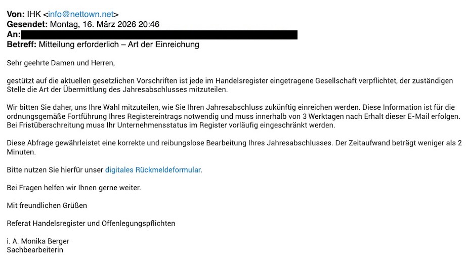 Die Nachricht fordert dazu auf, die „Art der Einreichung des Jahresabschlusses“ innerhalb von drei Werktagen über ein digitales Formular mitzuteilen. Absender*innen geben sich dabei als „IHK“ oder als vermeintliche Mitarbeitende aus.