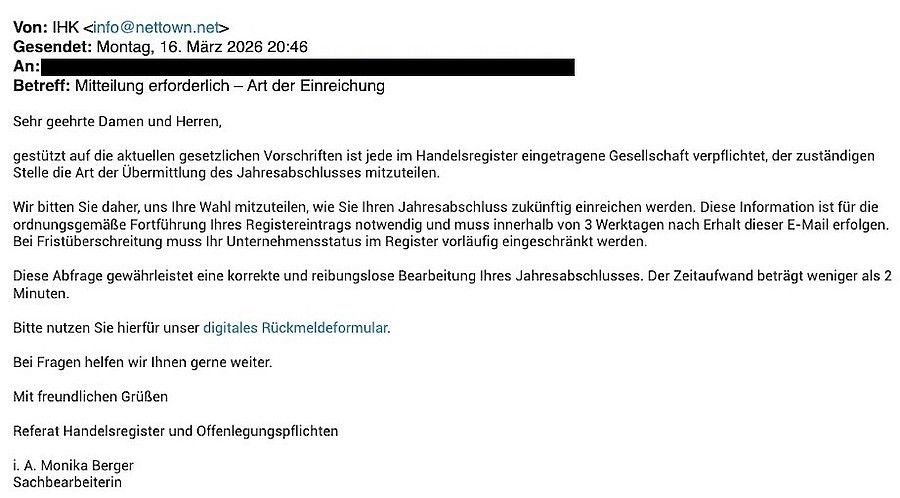 Bereits seit Ende 2022 sind Mails im Umlauf, deren Absender sich als DIHK oder IHK ausgeben, aber betrügerische Absichten verfolgen. Stets wird gefordert, dass Unternehmensdaten zu aktualisieren seien, und stets gilt: